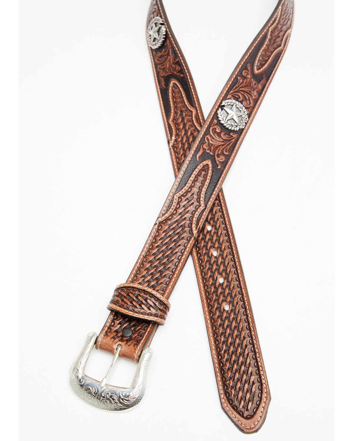 - Silver-tone etched western roller buckle