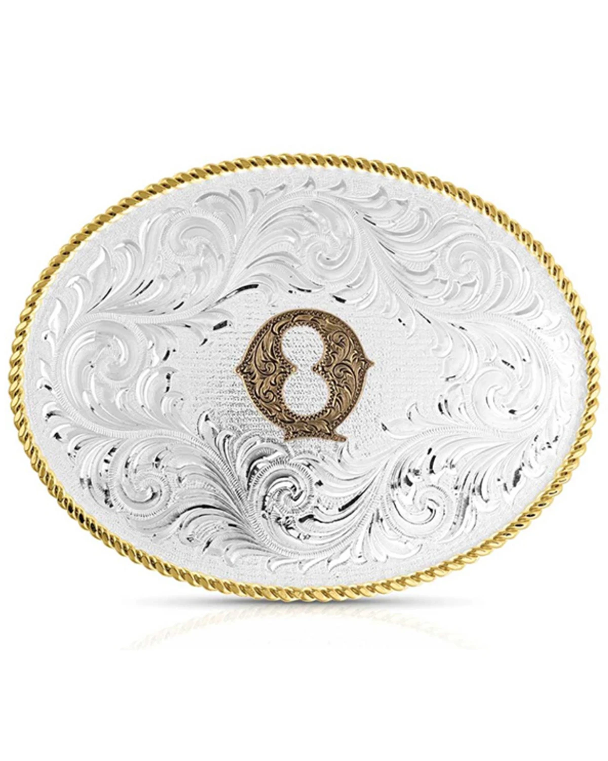 - Silver-toned oval buckle with gold roped border and “Q” on front with silver-toned filigree details