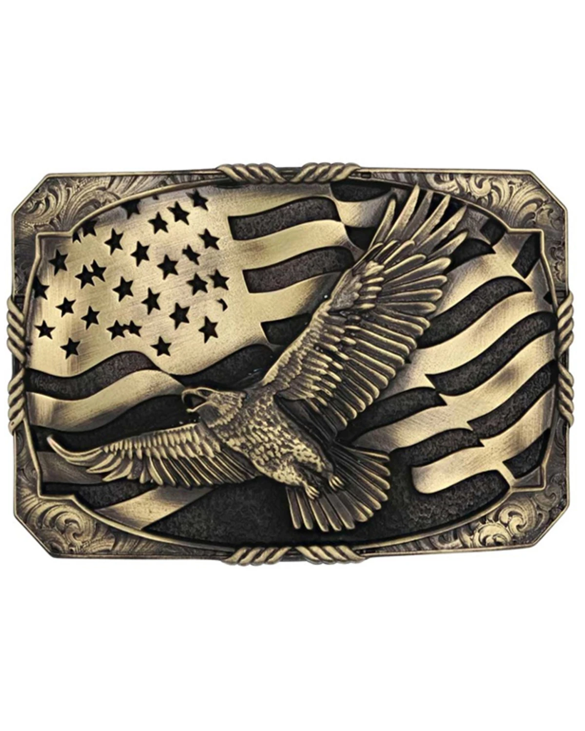 - Bronze-toned rectangular buckle with clipped edges and filigree border