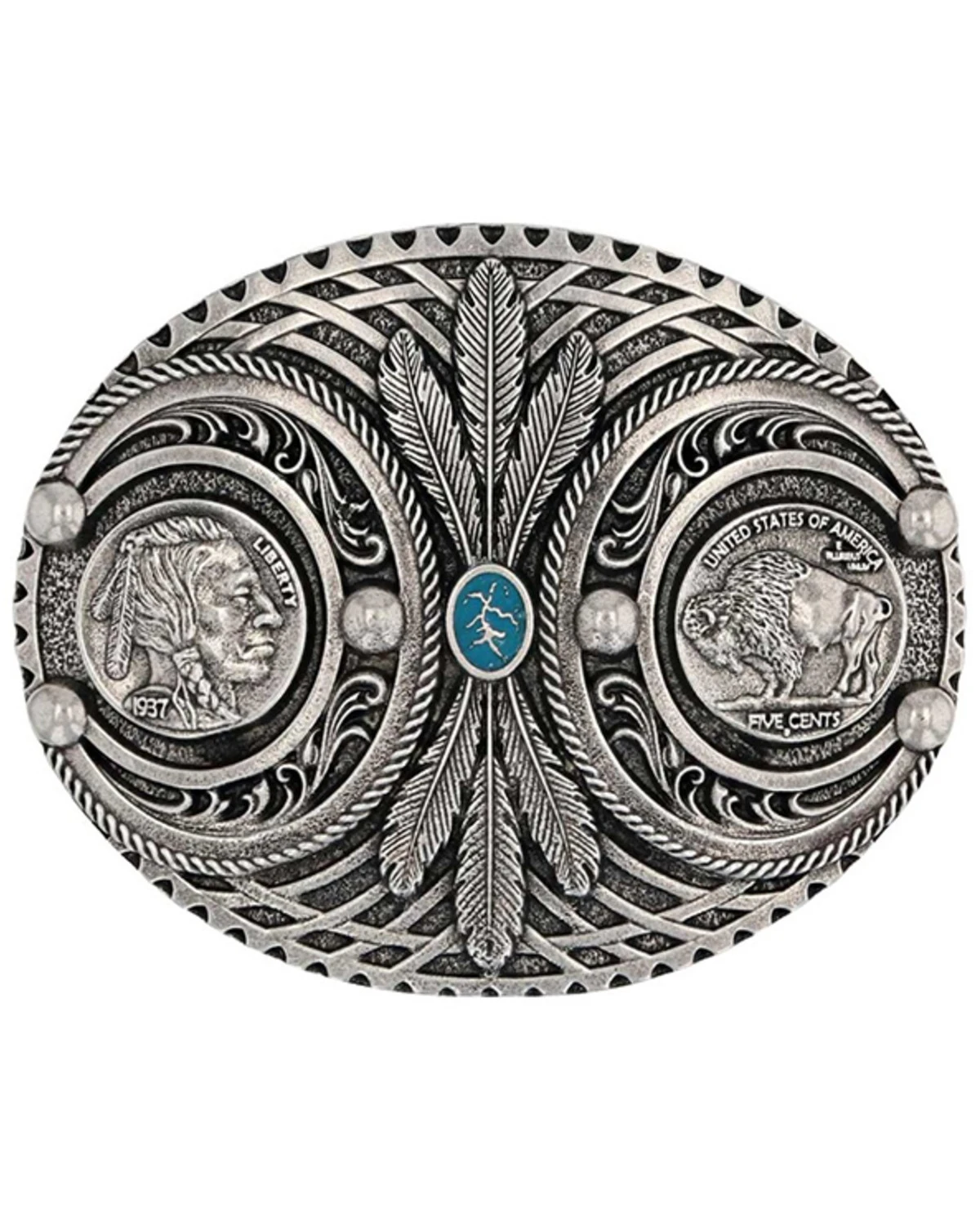 - Silver-toned oval buckle with etched feathers and oval turquoise painted pendant in middle